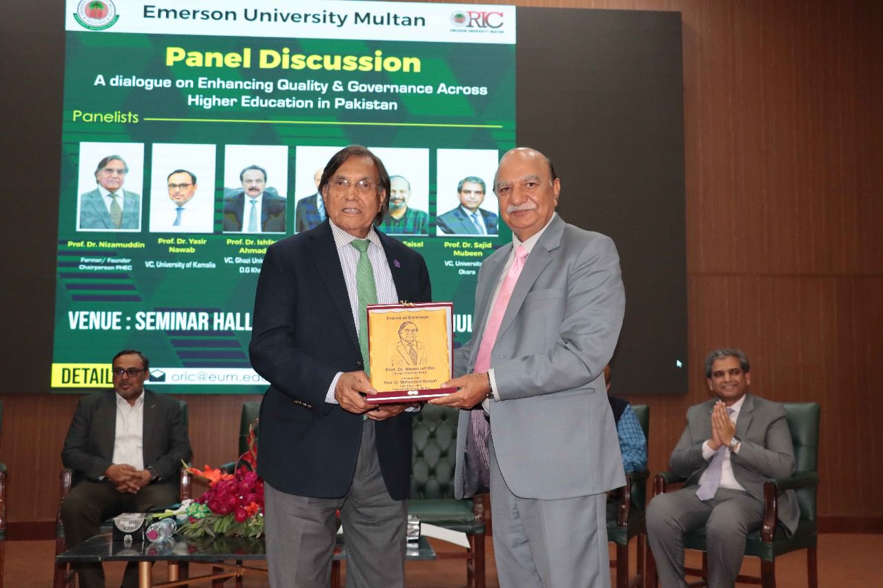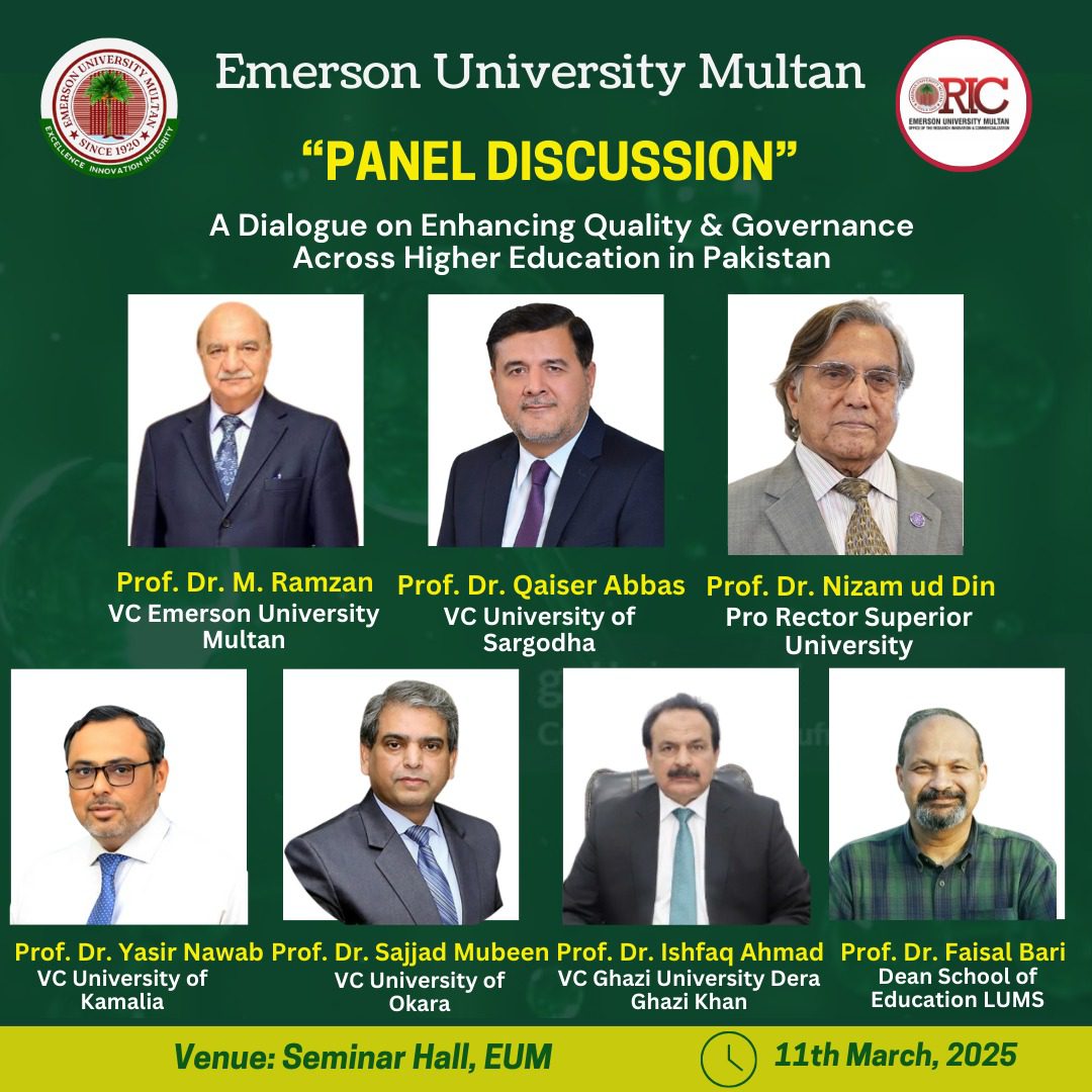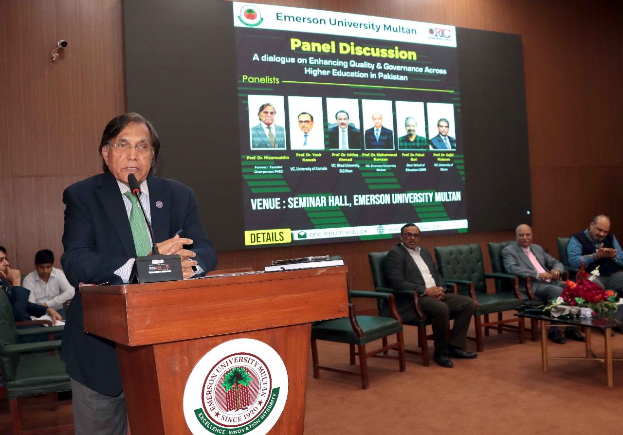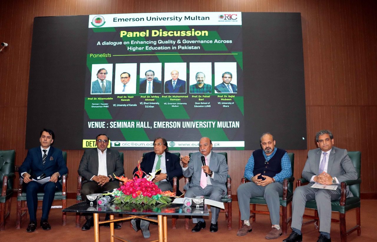 Emerson University Multan recently organized a high-level dialogue titled “Quality & Governance across Higher Education in Pakistan” at Al-Ghazali Hall, convening esteemed educationists, policymakers, and academic leaders to deliberate on the challenges and prospects within the country’s higher education landscape.