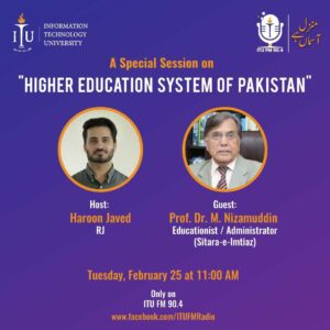Don’t forget to tune into ITU FM 90.4 tomorrow at 11 am for a worth-listening session on the “Higher Education System of Pakistan” with the guest speaker, Prof. Dr. Nizamuddin, who is an educationist and administrator, and holds Sitara-e-Imtiaz.