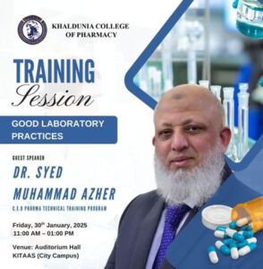 The session will be conducted by the distinguished Guest Speaker, Dr. Syed Muhammad Azher, CEO, Pharma Technical Training Program, who will share his professional expertise on laboratory standards, quality practices, and essential protocols required in pharmaceutical laboratories.